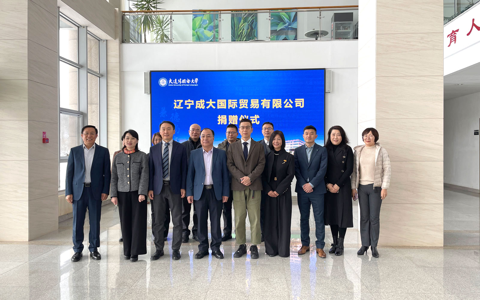 成大國際董事長金春洙、總經(jīng)理高原等一行七人,大外黨委副書記叢明才及相關(guān)部門負(fù)責(zé)人出席捐贈(zèng)儀式。儀式由大外校友工作處副處長卞瑩主持。